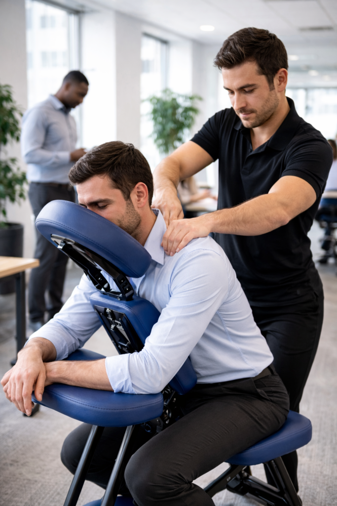Corporate chair massage is a short, on-site therapeutic massage (10–15-20 minutes) performed on a special ergonomic chair, usually at offices, corporate events, or conferences, and no clothing removal is required. .